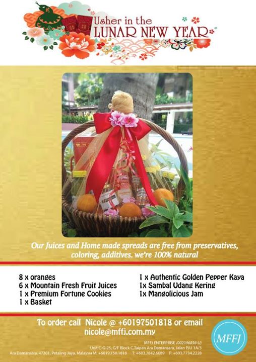 Gong hei fatt choy! It’s that time of the year for mega feasting and angpau collecting! We at Straits Heritage Foods has teamed up with Mountain Fresh Fruit Juices and Mangolicious to create this Chinese New Year hamper that includes homemade, all-natural goodies. A great gift for your foodie friends that includes Mountain Fresh’s fruit juices, our very own Golden Pepper Kaya and Sambal Udang Kering, as well as Mangolicious with their delicious mango jam. Of course, we’re throwing in some festive items such as oranges and fortune cookies as well.